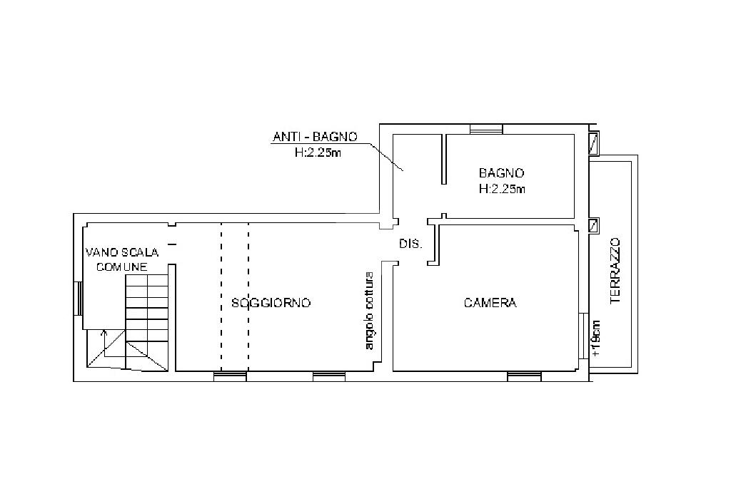 Ingresso sul soggiorno con angolo cottura, disimpegno, camera matrimoniale con accesso al balcone, bagno e ripostiglio. Possibilità di autorimessa (20.000).