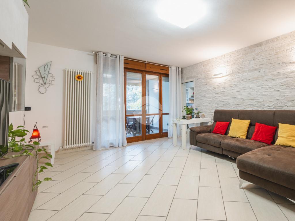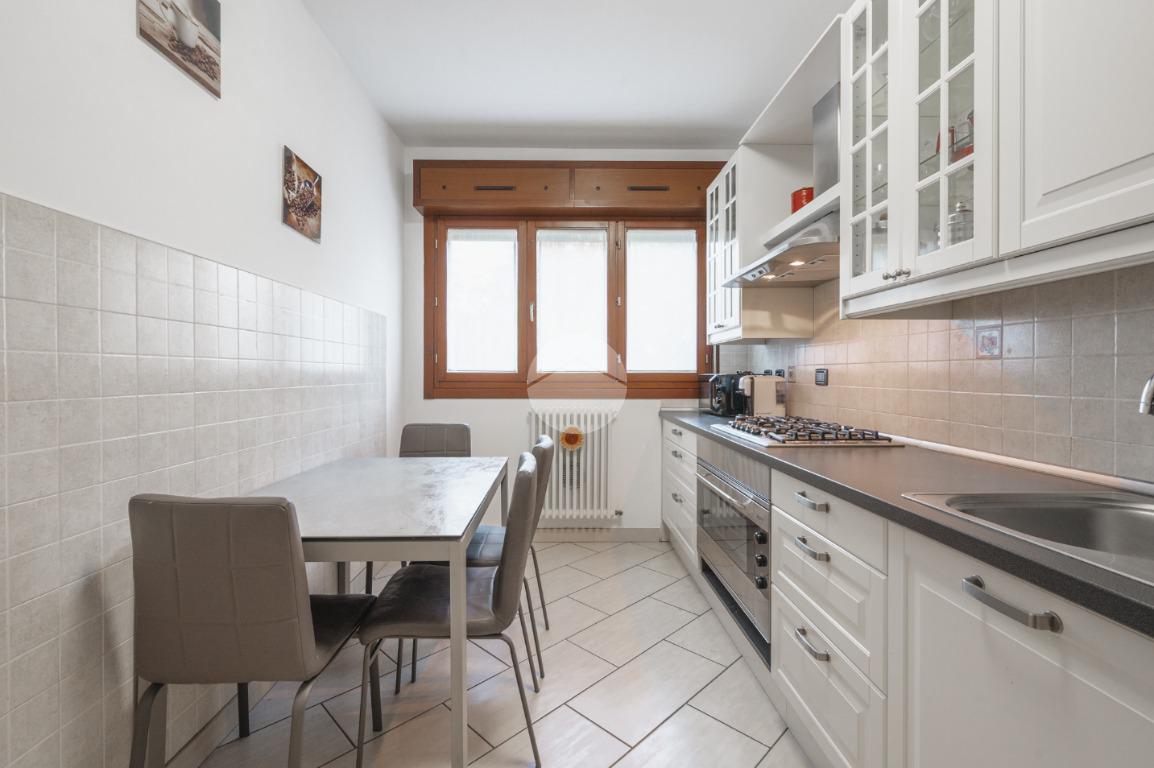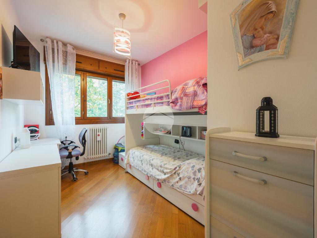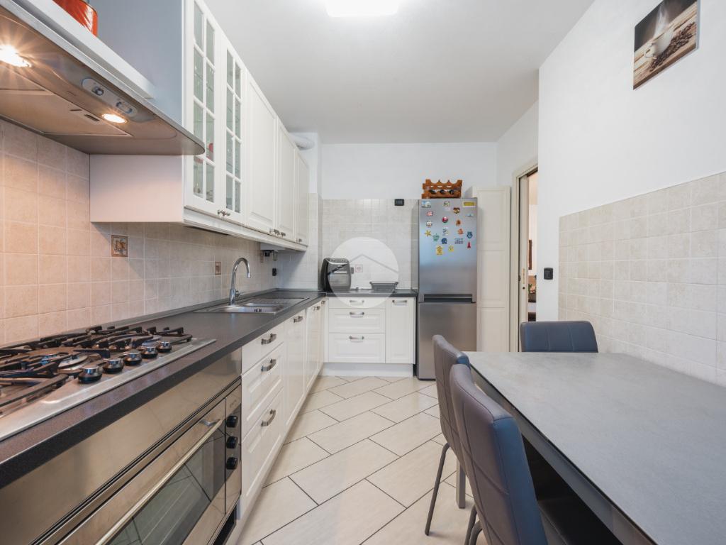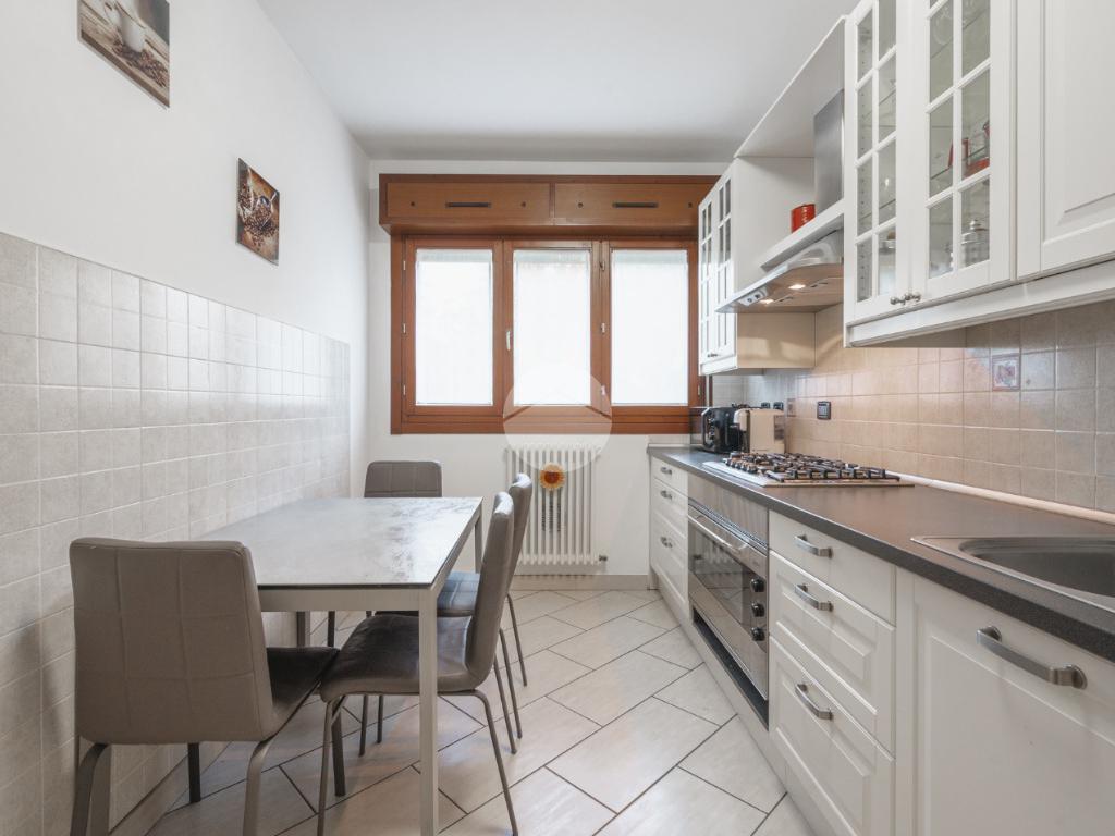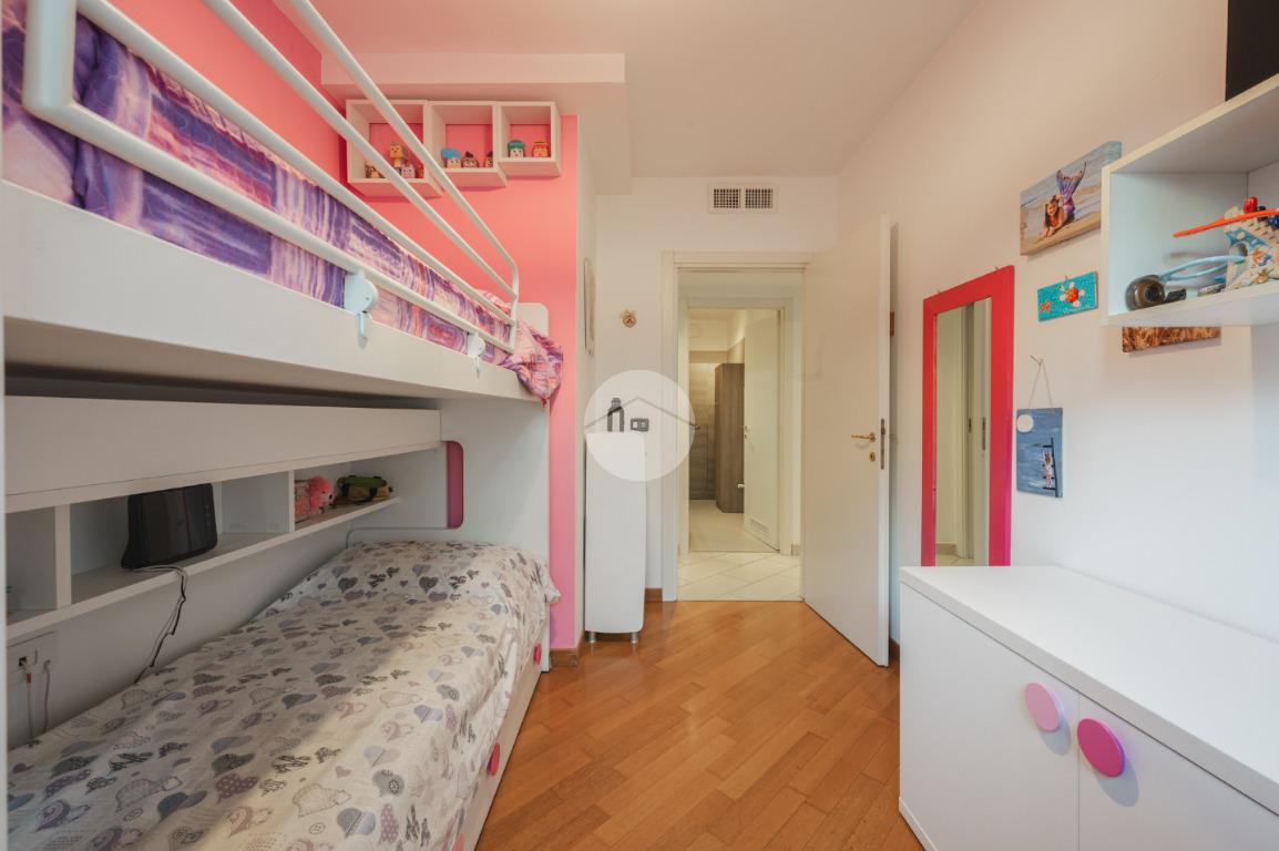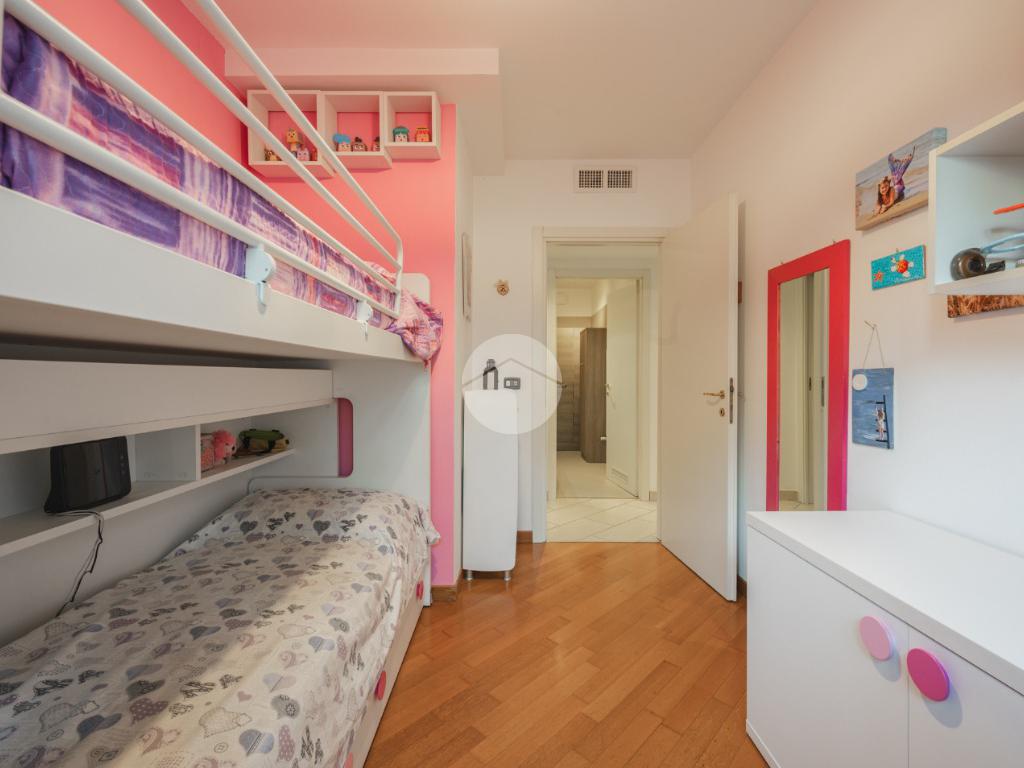 Ingresso sul soggiorno dal quale si accede al terrazzo loggiato, cucina abitabile, disimpegno zona notte, tre camere e due bagni. Al piano interrato possibilità di autorimessa doppia (€25.000,00). Infine l'immobile è dotato di un posto auto assegnato.