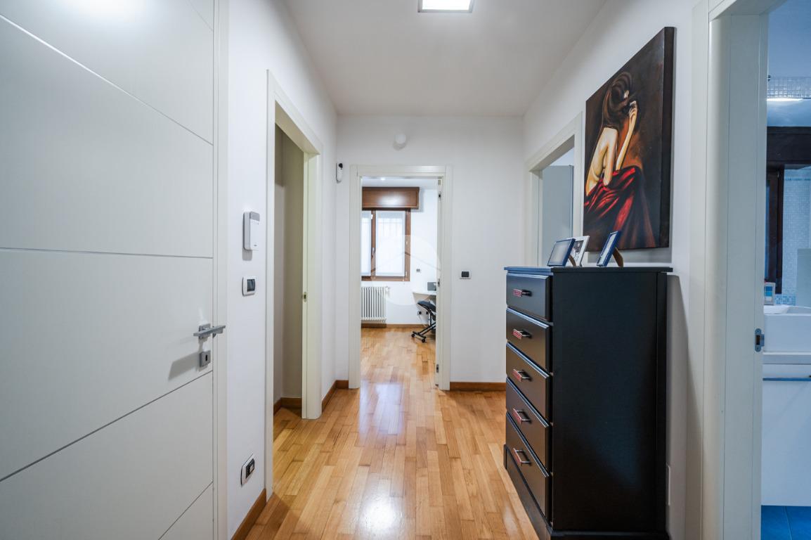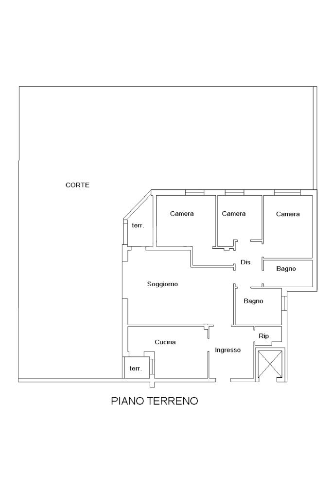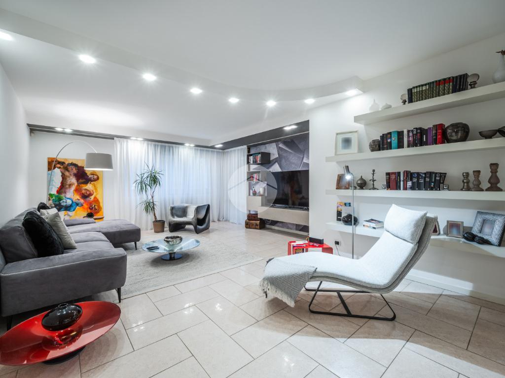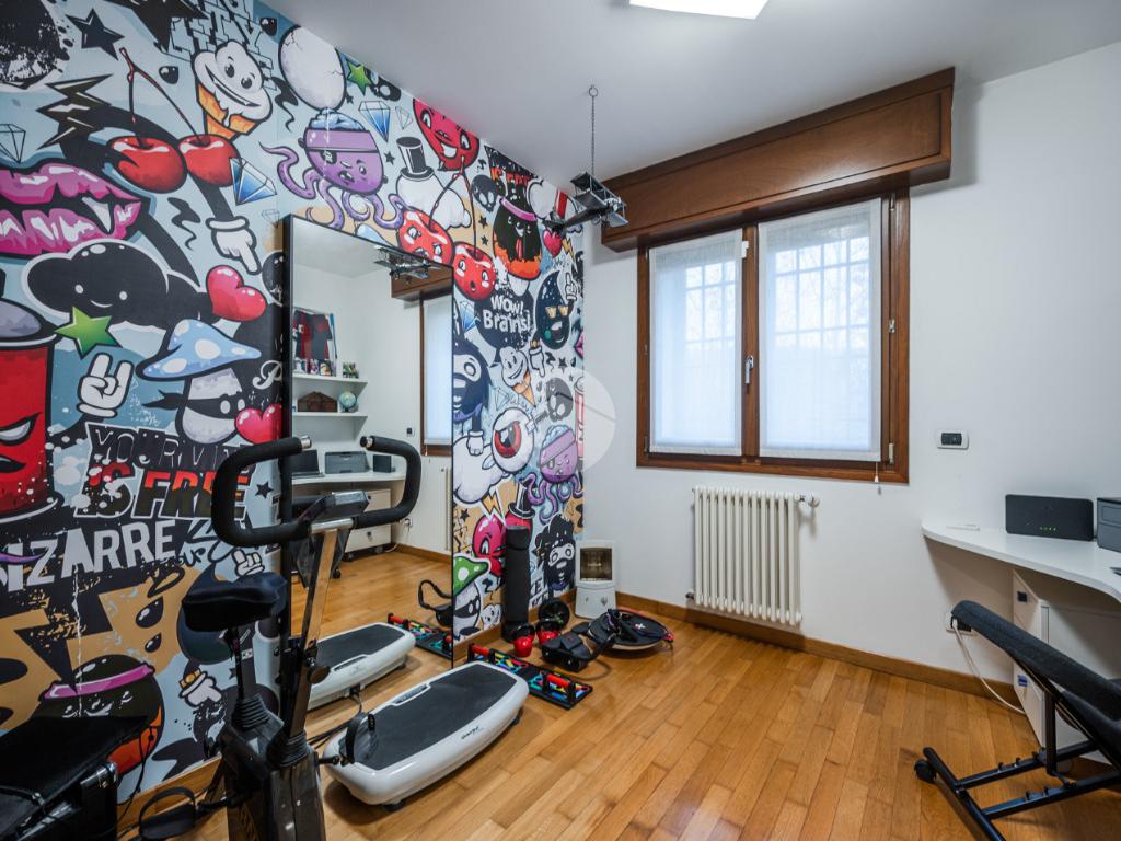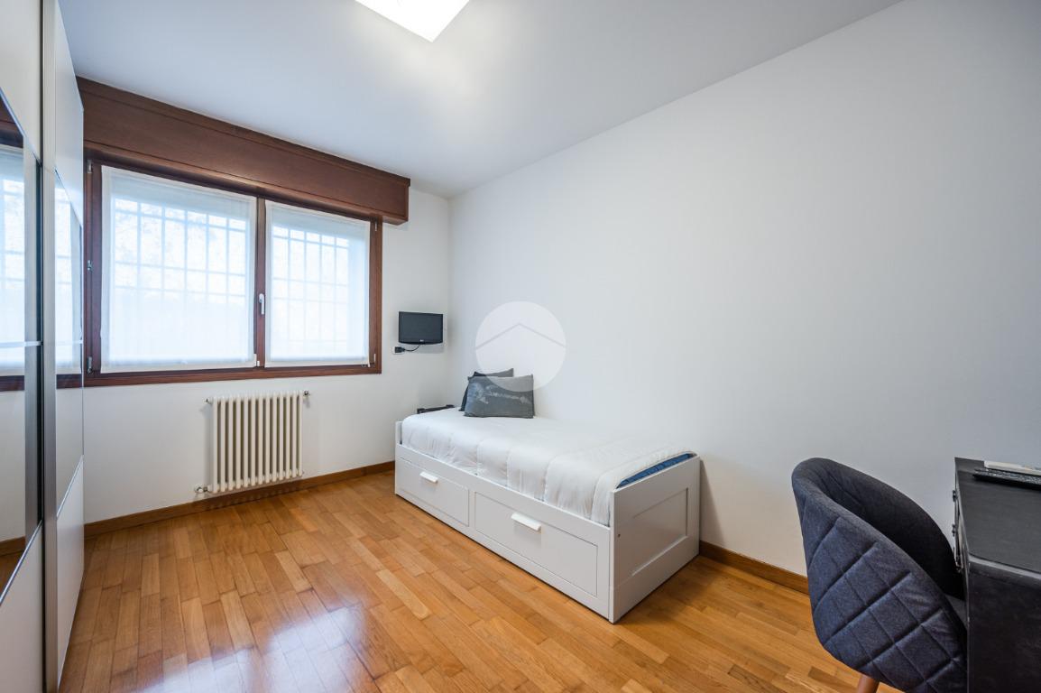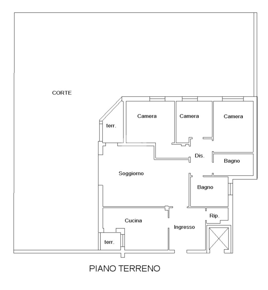 L'immobile è situato al primo piano ed è così composto: ampio atrio d'ingresso arredabile, zona giorno costituita da due ambienti separati, la cucina abitabile e la spaziosa sala dalle quali si accede al giardino privato. Tramite il disimpegno della zona notte si raggiungono le tre camere da letto e i due bagni. Infine l'immobile è dotato di un comodo ripostiglio.
